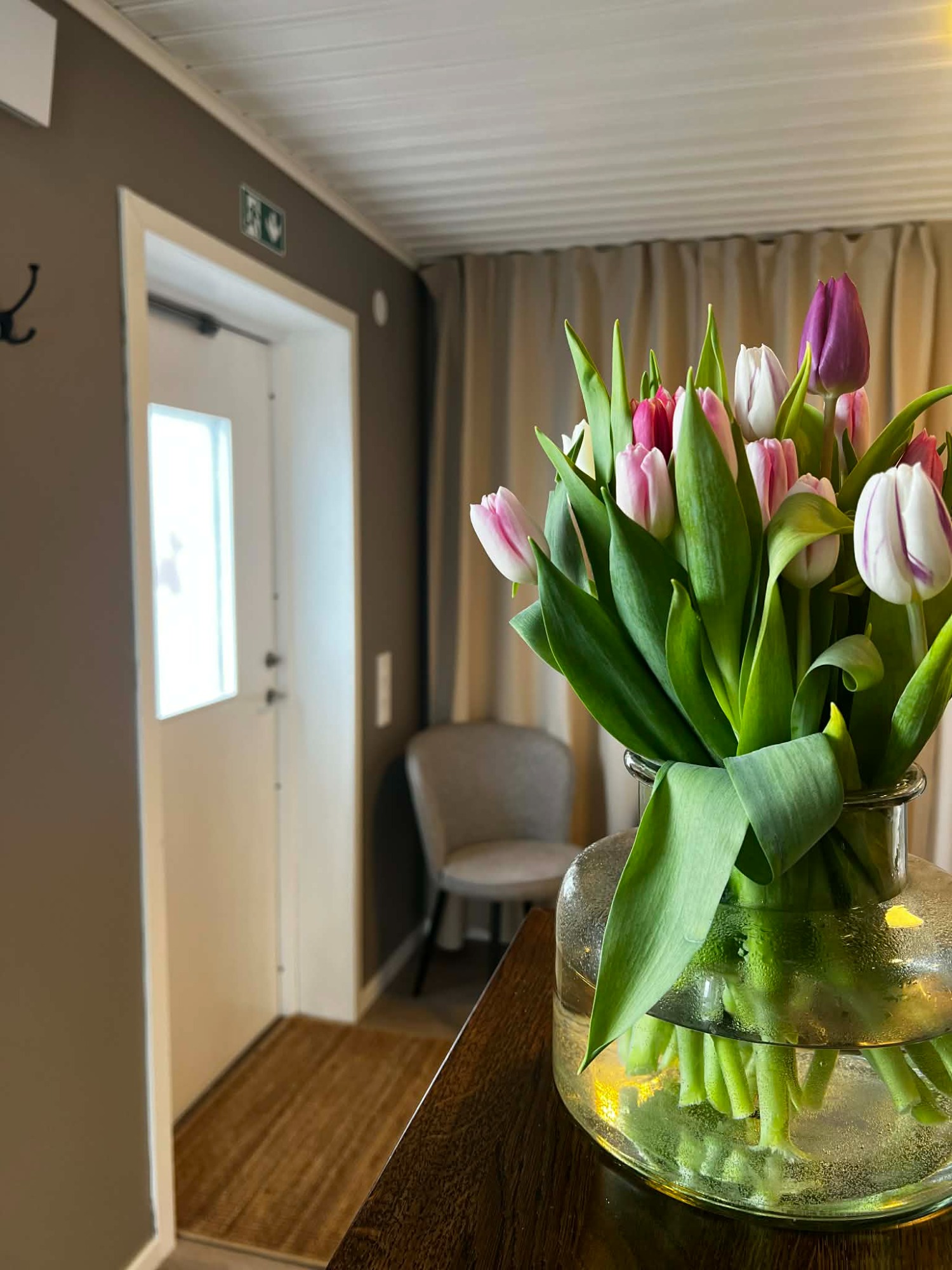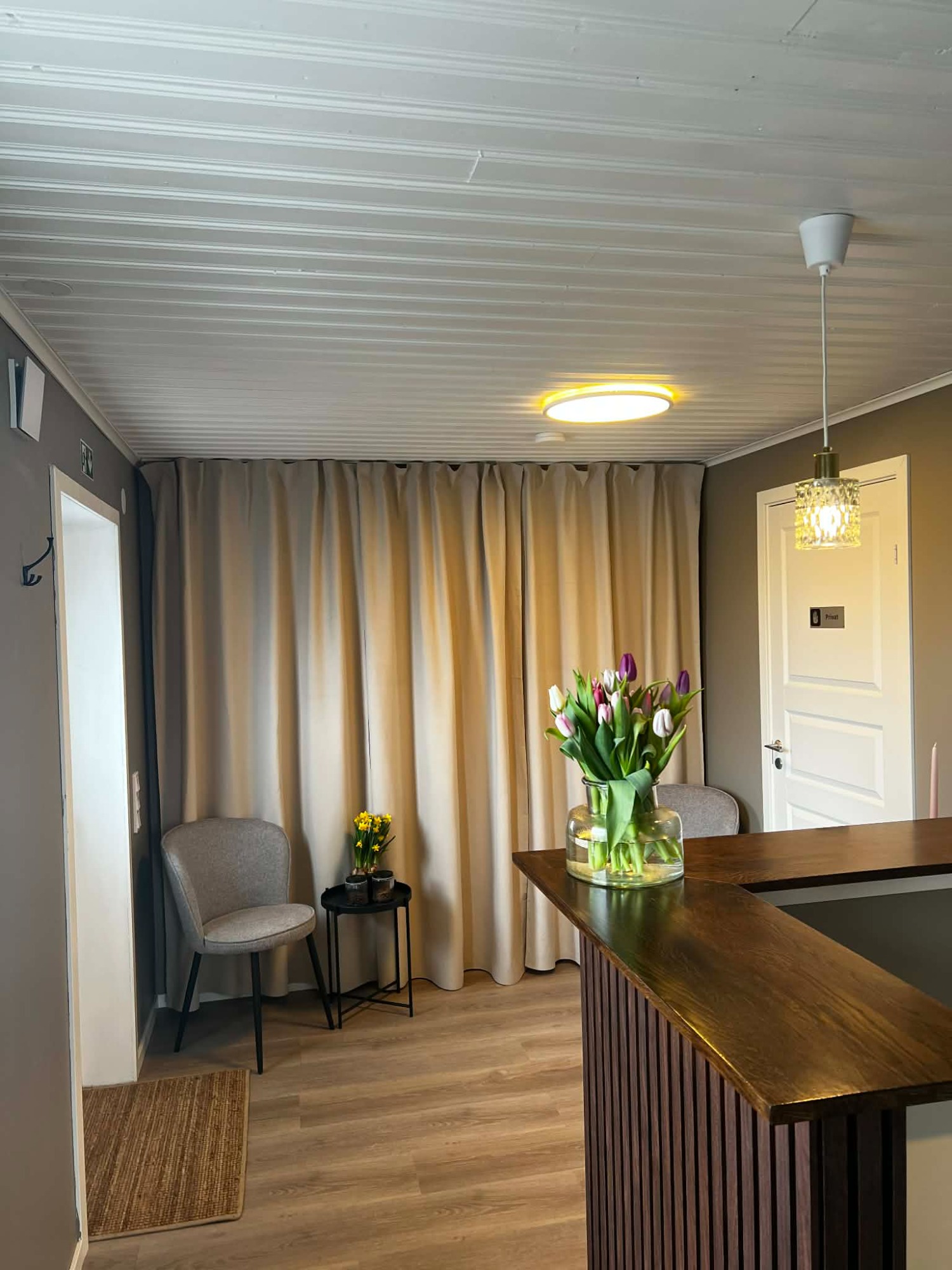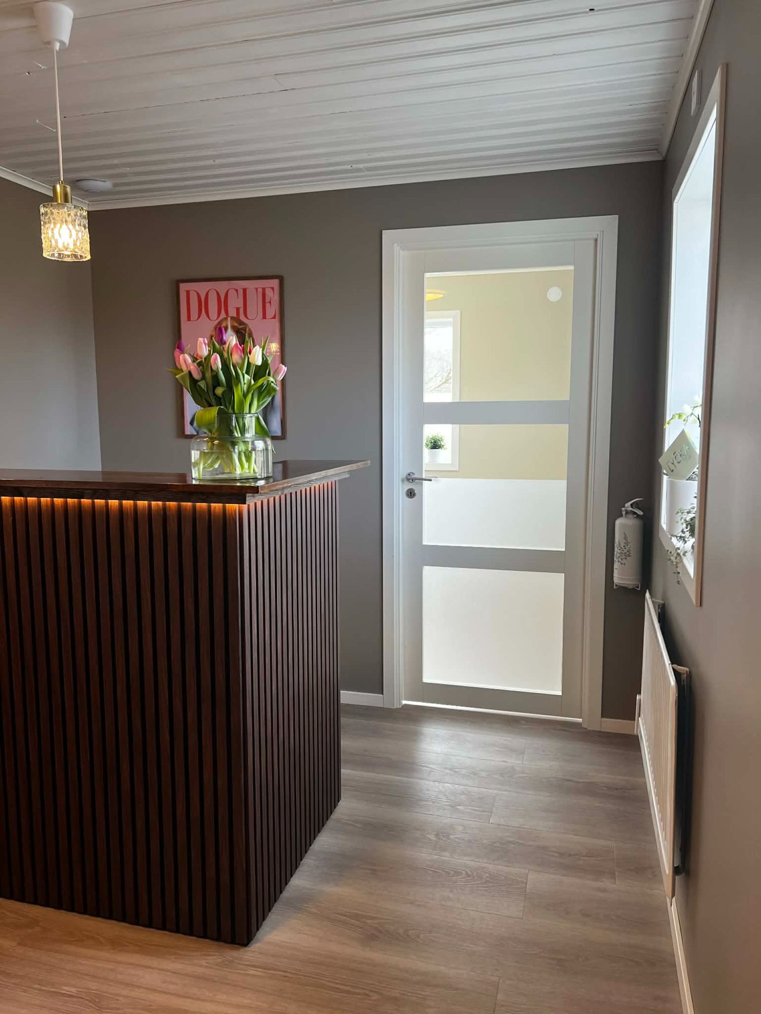 Det finns även en entré med sittplats för dig som vill sitta kvar under till exempel en kloklippning.